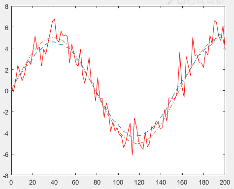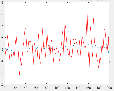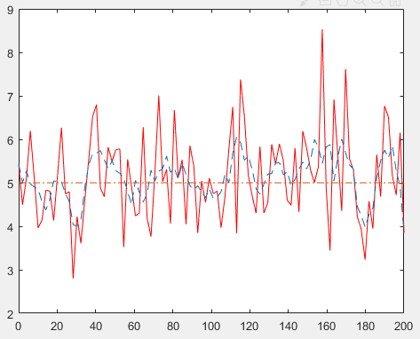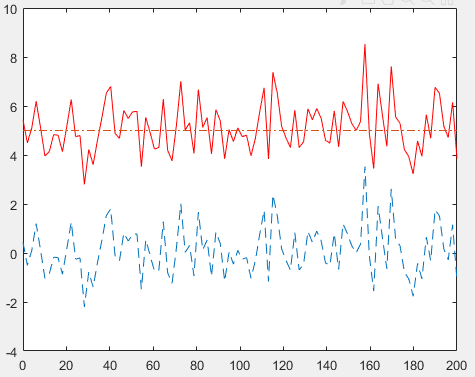 1、首先假设一种理想状态,现在有一个电压信号是两个信号的叠加(记作合成信号‘实线’),源信号是一个稳定的电压5V(‘-.-.-’),噪声是均值为0、标准差为1的正态分布的波动电压(‘—–‘)。波形图如下。