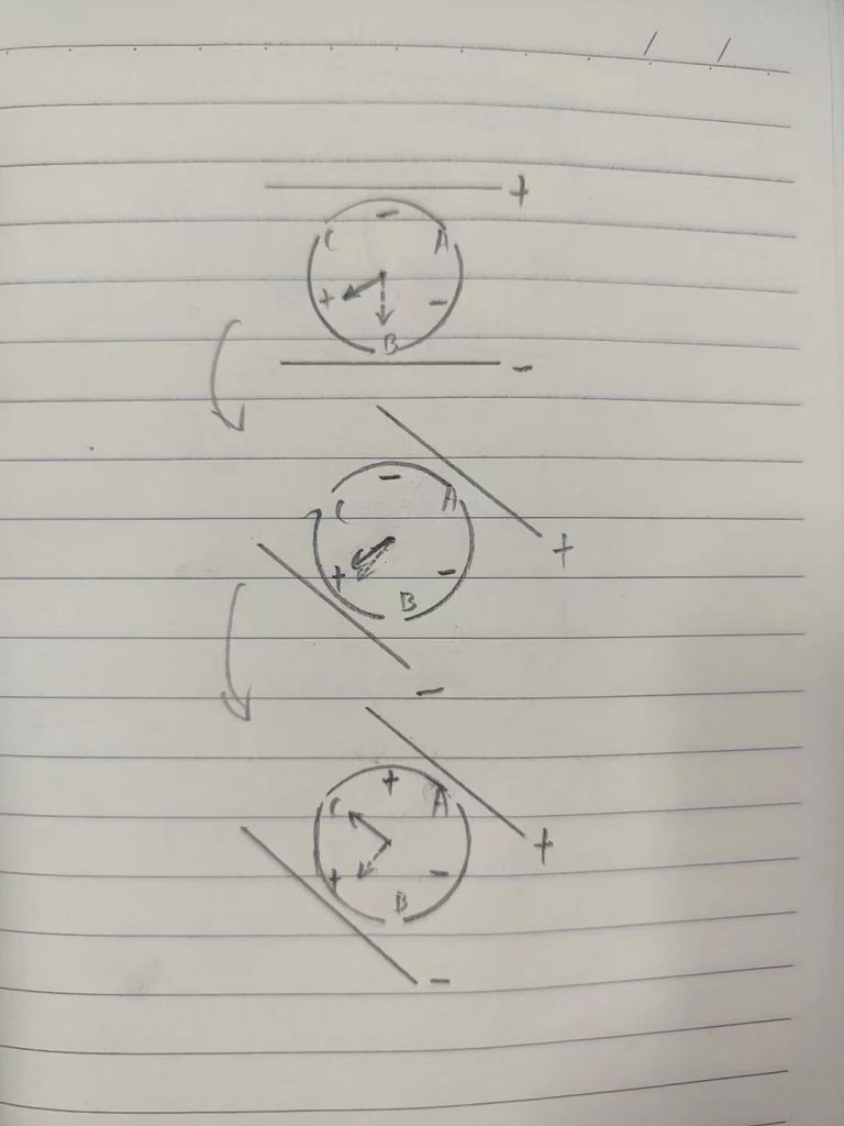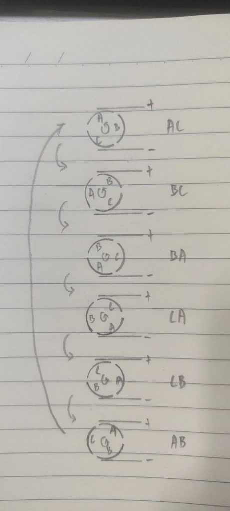 奈何博主cad太水,只能上手绘大法。首先把图中心的圆想象成有刷电机的三个金属片,而搭在金属片上的两条杠就是电刷,当电机按照逆时针方向旋转的时候,触碰到电刷的金属片也在不停的切换,当电机旋转一周,金属片(以及连接到内部的线圈)的通电顺序则也会按照AC、BC、BA、CA、CB、AB变换一个周期。