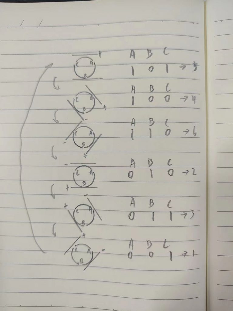 首先把图中的圆圈想想成无刷电机的定子线圈,而ABC就是线圈夹缝中的传感器。