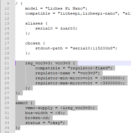 两个文件的两个根节点,其实就是同一个根节点。在根节点下添加3.3v设备。在根节点之外,启动mmc设备。