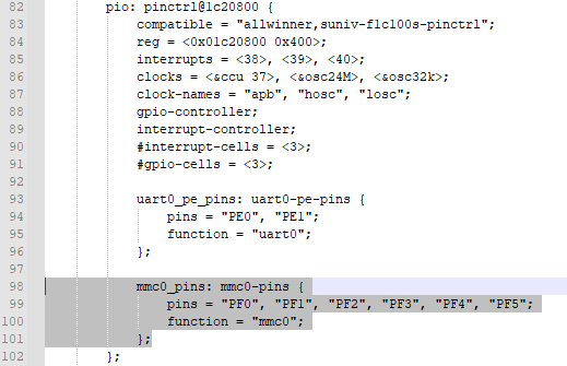 b、依然是文件suniv-f1c100s.dtsi,在soc节点下,添加mmc0设备