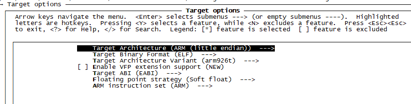 b、接下来,Enable VFP extension support是设置硬件浮点,因为f1c200s不支持,所以不勾选。Target ABI是应用程序二进制接口,选择EABI,因为它支持硬软件浮点混用。Floating point strategy选择softfloat,使用软件浮点。ARM instruction set选择ARM,即架构。