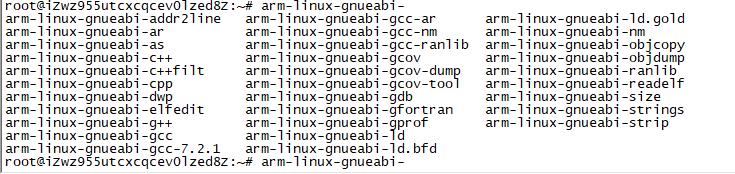 3、当执行完上述一大串命令后,在命令行输入arm-,然后双击Tab键,有时候需要按三次,若终端界面有arm-linux-gnueabi-gcc-7.2.1弹出,表示交叉编译环境安装成功。